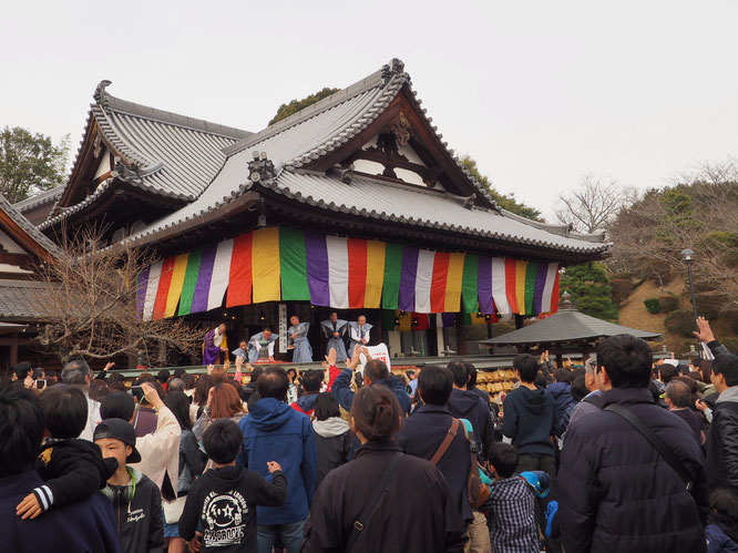 お会式(えしき)は,ご本尊の文殊菩薩を奉賛する年に一度の大祭で、文殊さまの御縁日に行われます。本堂前で参拝者の皆さんに僧侶により文殊さまの智恵袋を頭に当てることで智恵が授かると言われる「お加持祈祷」が行われます。両日とも、16時30分から智恵のお餅まきが行われ、境内には露店が並び、多くの人たちで賑わいます。詳細は安倍文殊院公式HPのお会式のページをご覧ください。