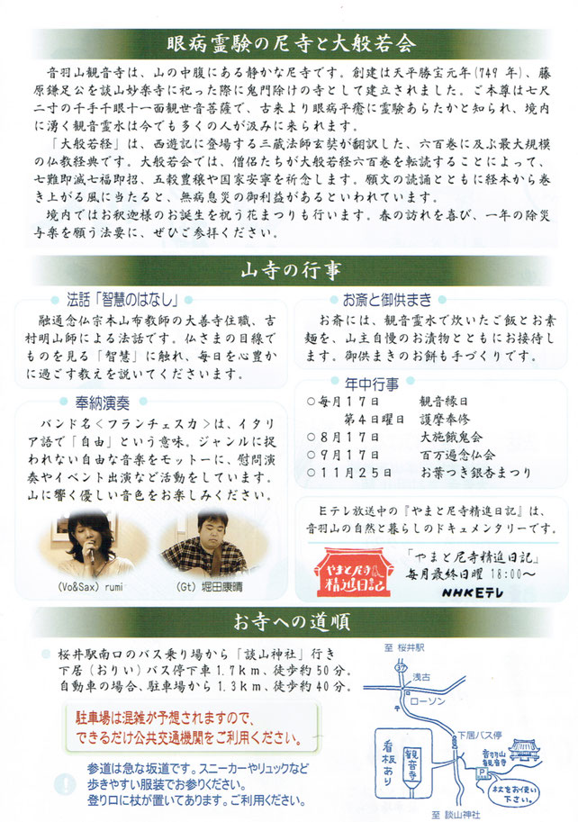 ○交通(車)西名阪針インターチェンジより20分。大祭の日には、桜井駅から臨時バスが運行されます。(祭典は、竹林寺で午前11時頃から行われます。)