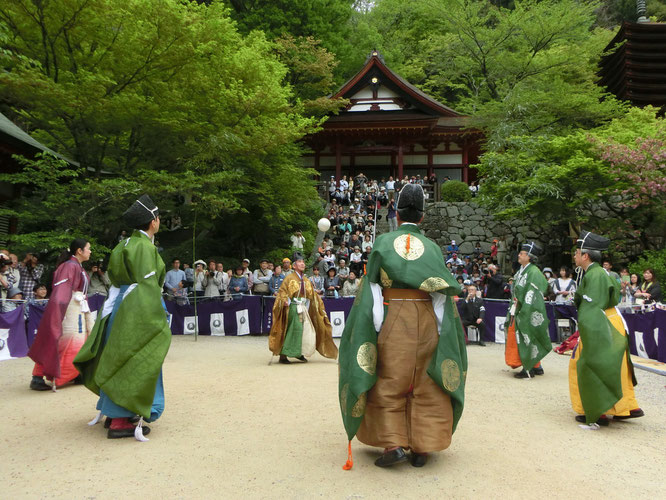 神事のあと清清しい新緑の中、境内では蹴鞠まつりが11時頃から行われます。古式ゆかしき装束に身をつつんだ蹴鞠保存会の皆さんが古式にのっとり、優雅に鞠を蹴りあう古典的な遊戯で、談山神社の祭神、藤原鎌足が中大兄皇子(後の天智天皇)に、ことよせ、蘇我氏討伐(大化改新)の相談をしたという故事にちなんだもので、多くの人たちで賑わいます。気持ちは飛鳥びと!