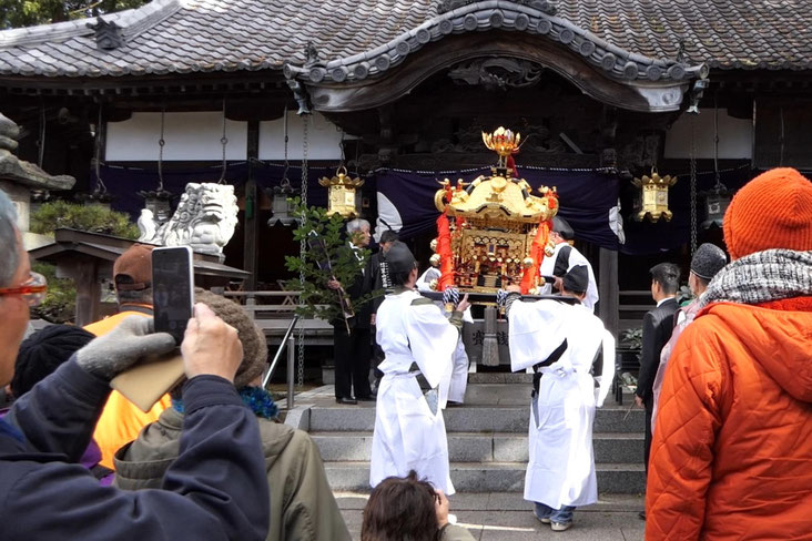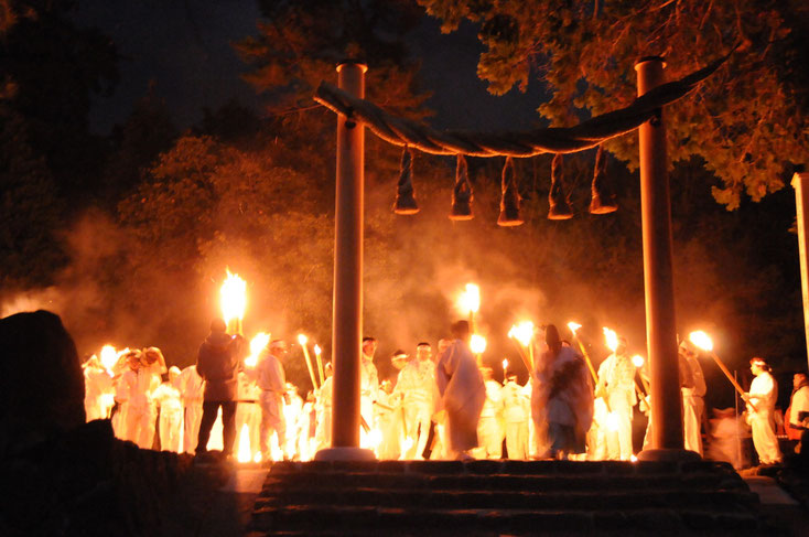 8時頃からは、集会所の神棚にともされた神灯めがけ、子供たちが濡れたわらを投げ付けて火を消し、当屋が火を再びつけますが、子供達がまた火を消し点火の邪魔をするといった最後の大暴れをし祭りは終ります。その後、頭屋が、ご分霊の宿るお屋形を集落の南に鎮座する山口神社へ運びます(神送り)。山口神社はお社がなく、ご神木の前に、吉野から持ち帰られる小石が積まれただけの神社です。神送りは、人と顔を合わせたり言葉を交わしたりしないで済む夜半に行われ、御幣を取り替え祭りは終了します。