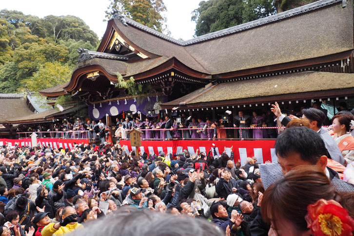 豆撒き式の時、拝殿前は福を授かろうと歓声を上げながら両手を伸ばす沢山の参拝者で埋め尽くされます。