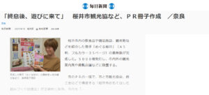 桜井市おもてなし仕組みづくり協議会発行の「めぐる桜井」が5/15付けの毎日新聞に掲載されました。有料ですが電子版でもご覧いただけます。