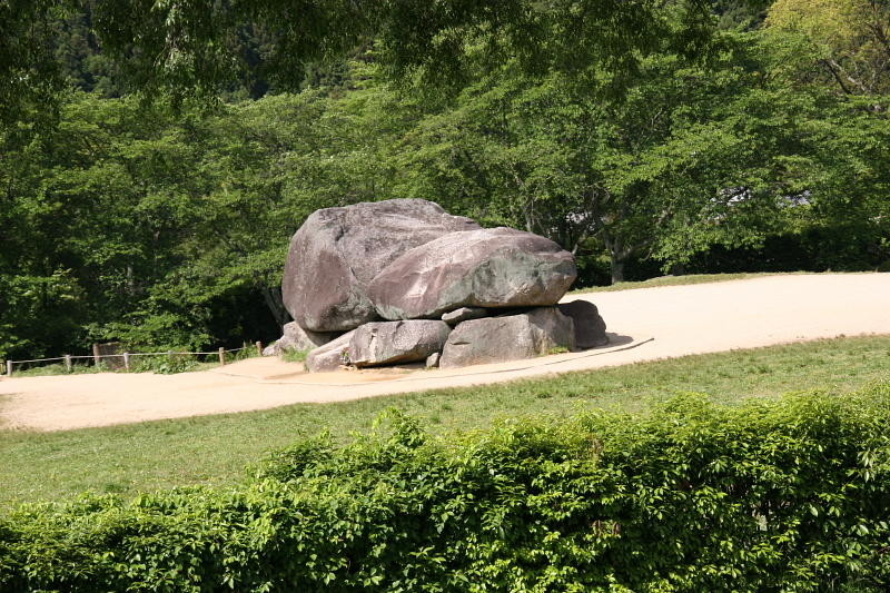 明日香村島庄にある日本を代表する巨大な横穴式石室です。1辺55mの方墳で西南方向に開口しています。墳丘上部は江戸時代以前からむき出しで元々の形状は不明です。
