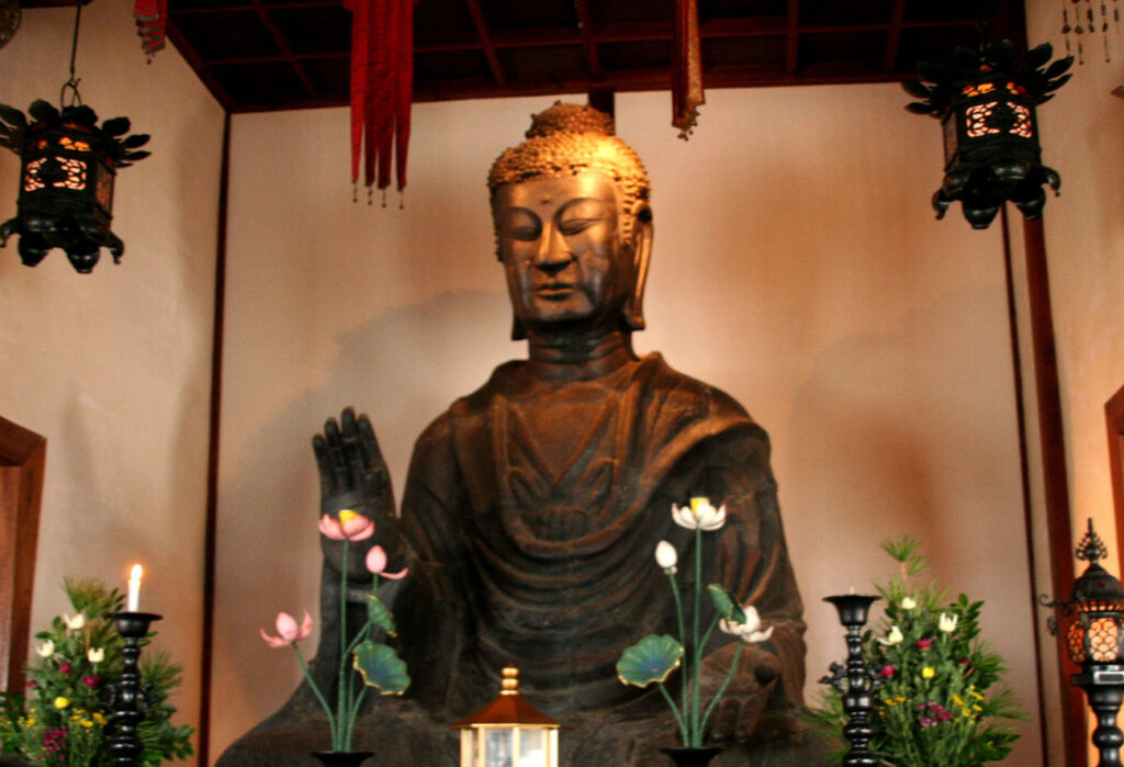 本尊の国重要文化財で現存する最古の金銅仏とされる飛鳥大仏(釈迦如来座像)は609年(推古天皇17年)に、止利仏師によって造られた日本最古の仏像です。鎌倉時代の火災で顔と手以外が失われ、補修されたと記す文献があり、当初の部分が少ないと考えられ、国宝には指定されていません。