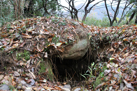 ●1号墳・・・径13~18mの円墳の右片袖式横穴式石室を持ち南西方向に開口している。現存長は約6m、玄室長3.5m、幅約2m、高さ3m、羨道部長2.5m、幅約1m、高さ1.5m。石材は奥壁が8段程度、側壁が7段程度で構成され高さ約1.5m位から上部を四方から持ち送って角部には三角持ち送りの石材を入れ、角をつくらないようし天井部の面積を狭くした窮窿式(ドーム型)と呼ばれる石室である。出土品としてはは須恵器杯蓋と土師器長頸壷のほか、本古墳出土とされる須恵器高杯などが伝えられている。この古墳群の中では目玉的存在の1号墳の石室は現在、土圧により傾いており安全上の問題で見ることが出来ません(開口部には土嚢が積まれています)