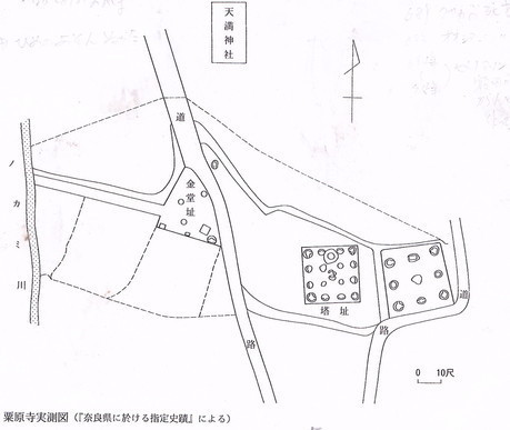 粟原寺は桜井市の東部、竜門山塊の北麓に位置し集落の南側にある天満宮の裏手のやや高い場所にあります。塔跡などの礎石が残っていますが発掘調査は行われておらず伽藍配置など詳細は不明です。