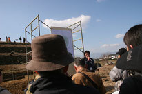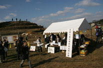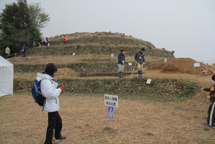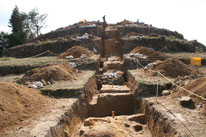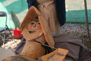 墳丘の調査での出土遺物は円筒埴輪、朝顔形埴輪、きぬがさ型埴輪,壺形埴輪などがありますが、特に第4次調査で発見された日本最古級の人物埴輪は大きな話題となりました。人の形を模した「盾持人埴輪」で、墳丘東側のくびれ部付近に流れ落ちた状態で発見されました。この盾持人埴輪は、邪悪なものから古墳を守るため、古墳外縁部に置かれたと思われます。被葬者は地元では、倭佐保姫の御陵として言い伝えられています。