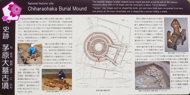 桜井市茅原に所在する帆立貝式前方後円墳で復元長は全長約86m、後円部径約72m、高さ約9m、前方部長さ約15m、高さ約1mで埴輪及び葺石を持つ古墳です。前方部を北に向け周濠の痕跡と見られる池があります。埋葬施設は従来不明とされてきましたが2013年12月の地中物理探査で、埋葬施設は「粘土槨」の可能性があり、しかも盗掘の形跡もなく良好な形で残っていると考えられると新聞発表がありました。