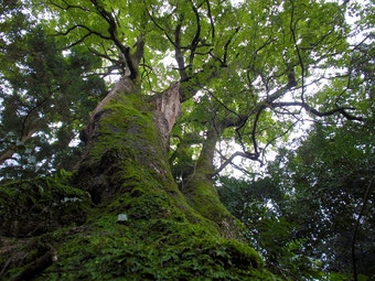 境内には拝殿があるのみで、神殿はありませんが山を拝する形はとっておらず、一説に杉樹をご神体とすると伝えます。小さな神域ですが境内にある楠の大木(桜井市指定文化財)が隠れた人気で、その大きさには誰もが圧倒されます。室町時代に金閣寺が造営される時、天井の一枚板として楠が供出されたとの伝承があり、今の楠はその二代目と伝えます。